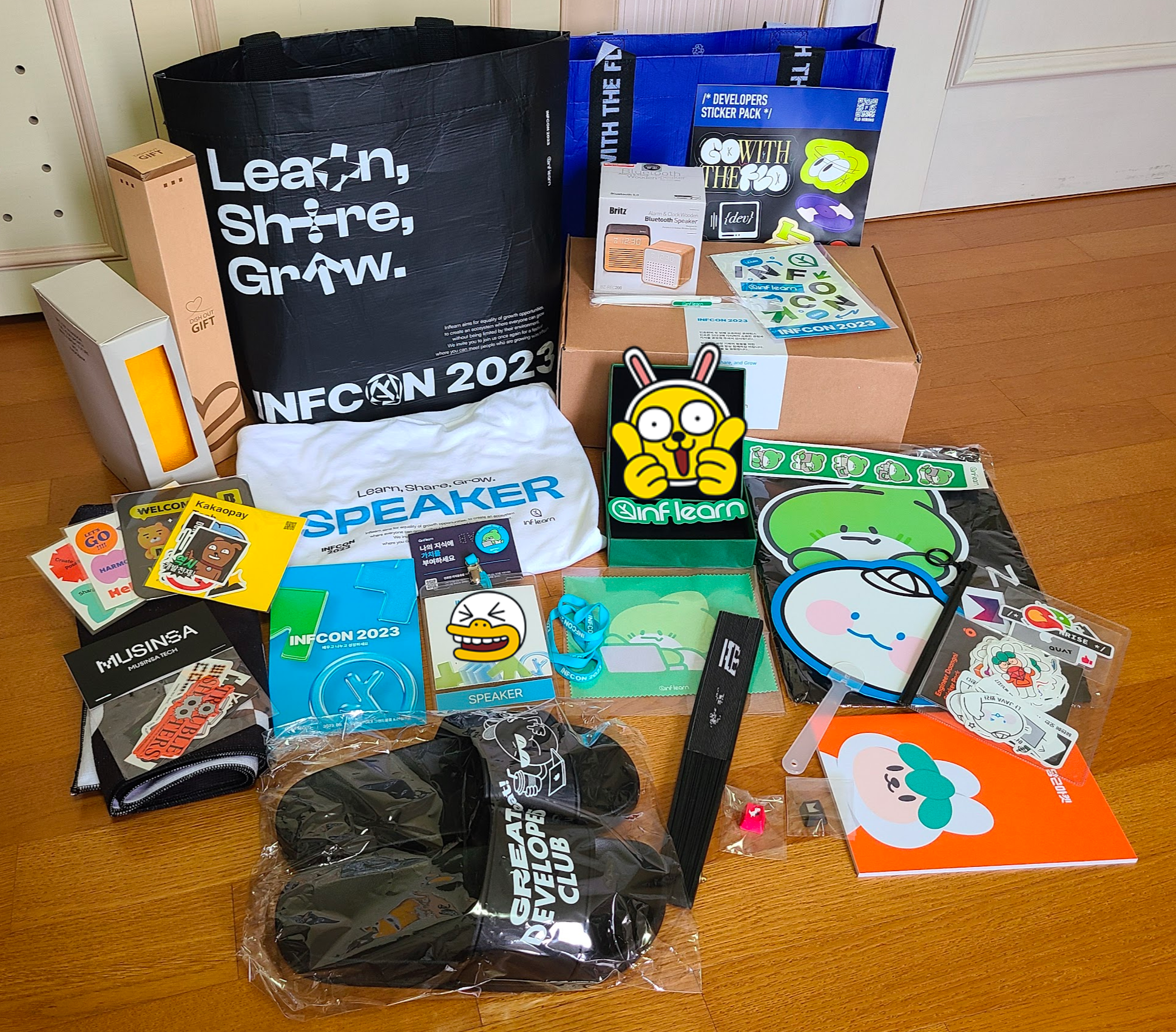 인프콘에서 받은 굿즈들입니다. 인프런의 새 마스코트 캐릭터가 굉장히 귀엽습니다 🙂